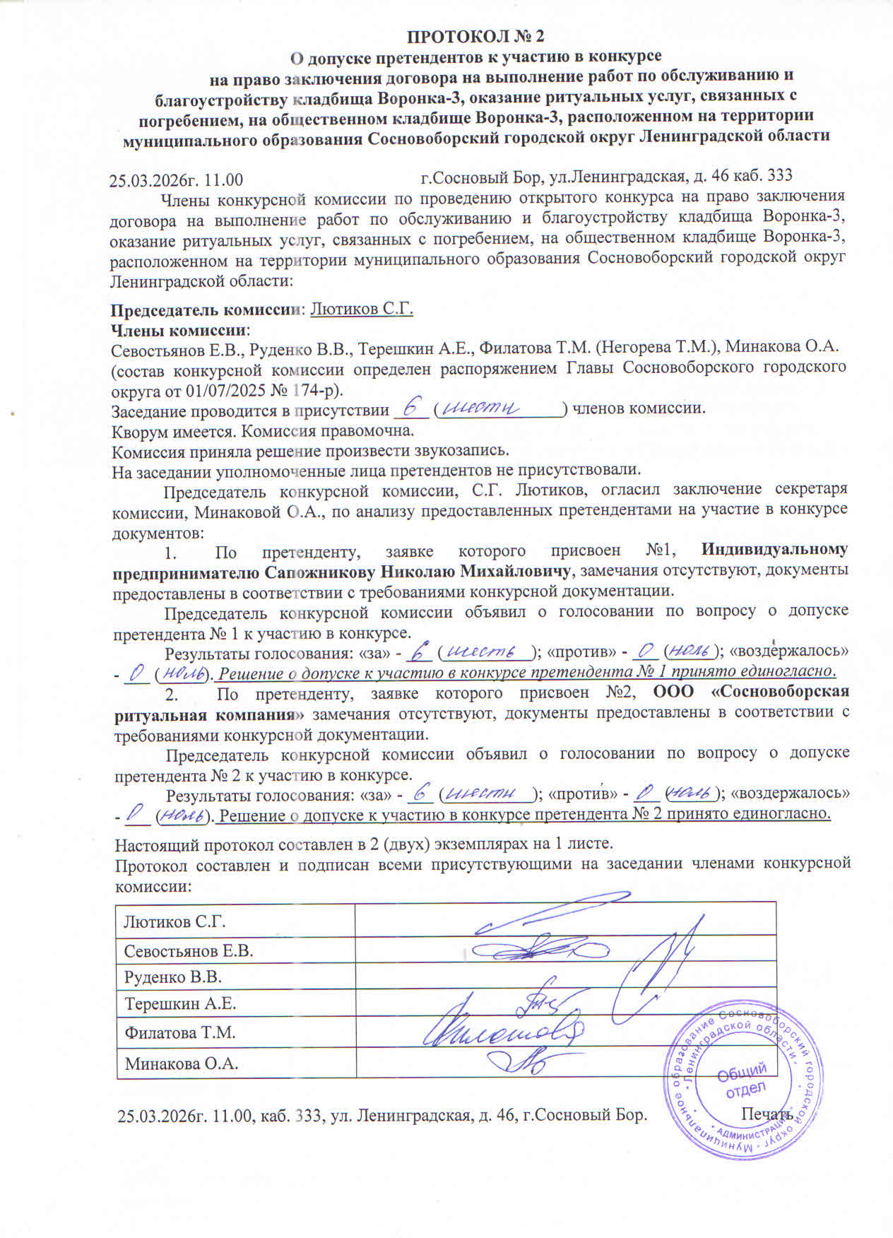 О допуске претендентов к участию в конкурсе на право заключения договора на выполнение работ по обслуживанию и благоустройству кладбища Воронка – 3, оказание ритуальных услуг, связанных с погребением, на общественном кладбище Воронка – 3, расположенном на территории муниципального образования Сосновоборский городской округ Ленинградской области
