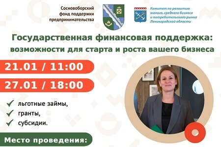 О доступных субсидиях, грантах, микрокредитных продуктах и других формах поддержки для бизнеса в 2026 году расскажет директор Сосновоборского фонда поддержки предпринимательства Олеся Калюжная.
